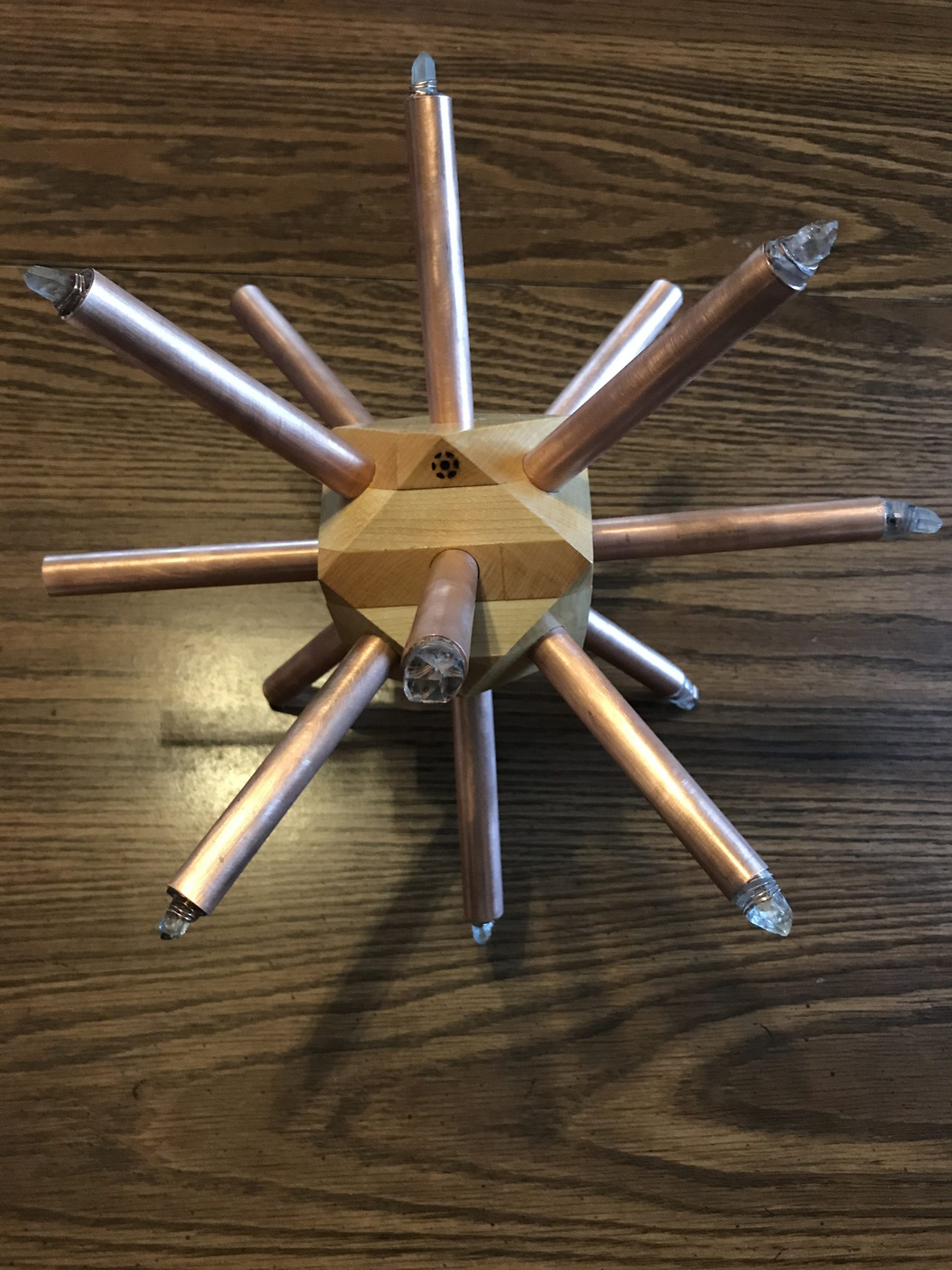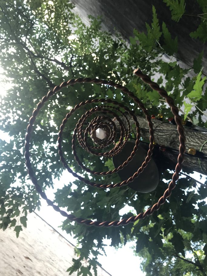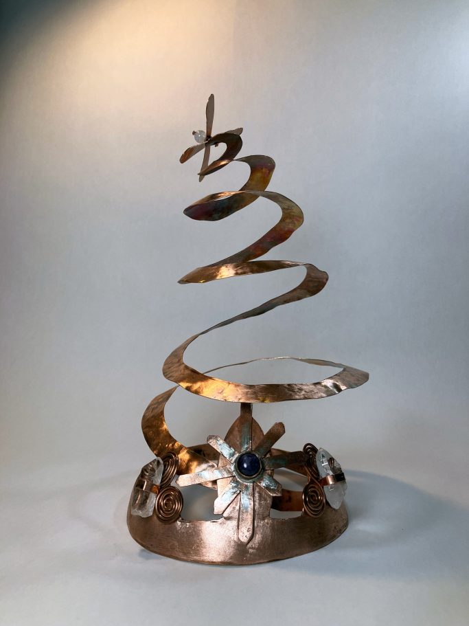 2019 Mixed media sculpture: copper, various crystals. Exhibited at “Impeach Death”, The Museum without a Building: Le Petit Versaille, NY